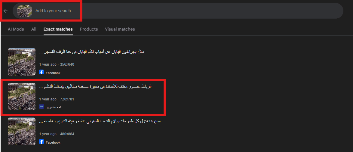 أرشد البحث العكسي عن لقطة ثابتة من المشهد الثالث الظاهر في مقطع الادعاء عبر محرك البحث جوجل إلى منصة فيسبوك، حيث نشرت إحدى الصفحات المغربية مشاهد من المظاهرة ذاتها بتاريخ 4 يناير 2024، بعنوان “الرباط | مسيرة الخميس 04 يناير 2024”