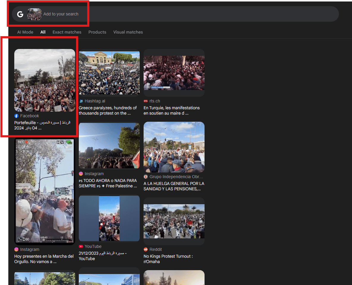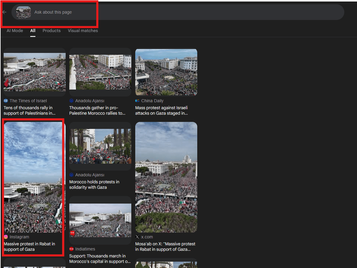 أرشد البحث العكسي عن لقطة ثابتة من المشهد الثاني الظاهر في مقطع الادعاء عبر محرك البحث جوجل إلى منصة إنستغرام، حيث نشر المصور المغربي مصعب الشامي المشاهد ذاتها بتاريخ 15 أكتوبر 2023، بعنوان “تظاهرة ضخمة في الرباط دعمًا لغزة”