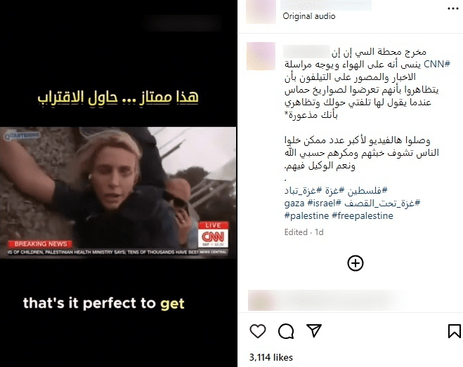 نشرت إحدى حسابات إنستغرام الادعاء بتاريخ 14 أكتوبر 2023، محققاً آلاف التفاعلات،
