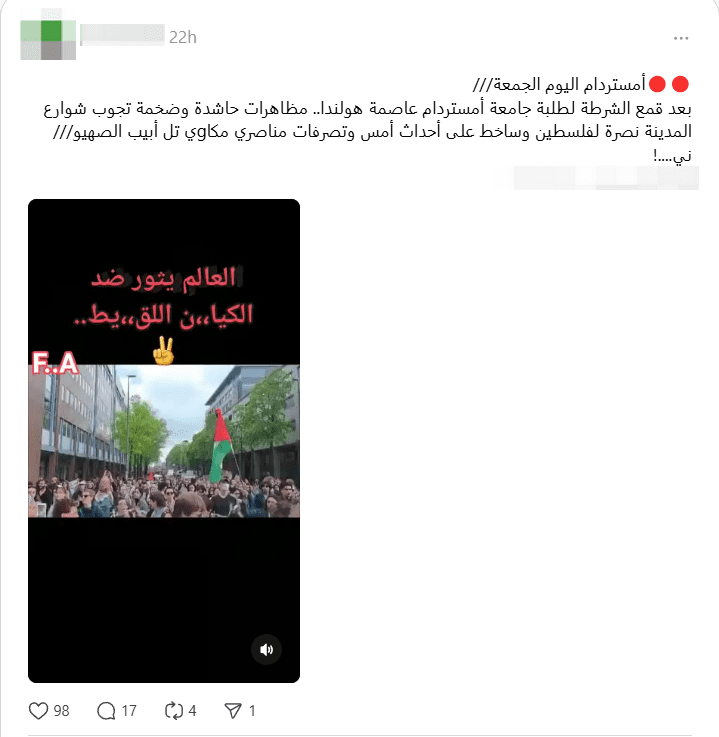 حيث نشرته العديد من الحسابات والمنصات الإخبارية في منصة إكس آنذاك على أنه يظهر مظاهراتٍ تجوب شوارع أمستردام،