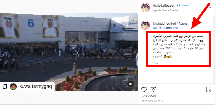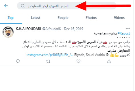 من خلال البحث عن الكلمات الدلالية التالية (الحرس الأميري أرض المعارض) في تويتر، عثر فريق فتبينوا على تغريدة تعود لحساب K.H.ALFOUDAR وأرفقها برابط لمقطع فيديو على الانستغرام،