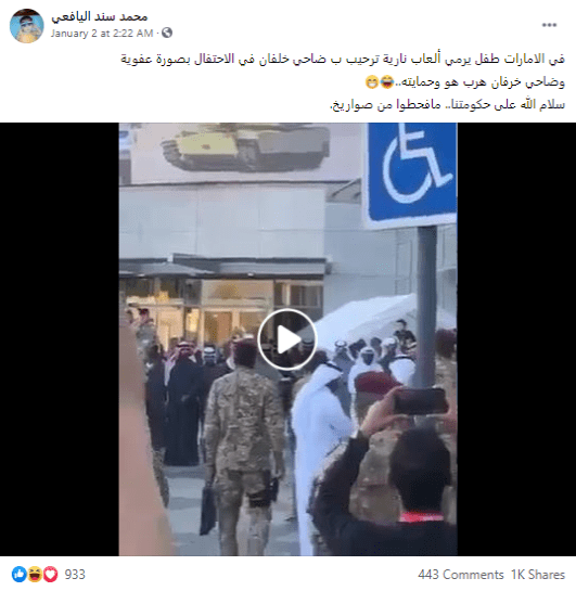 انتشر على منصة الفايسبوك مقطع فيديو ادعى ناشروه بأن طفل قام برمي العاب نارية ترحيبًا بضاحي خلفان وقام الحرس بحمايته واخلاءه من المكان