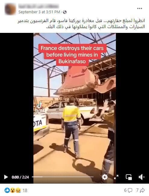 تناقل ناشطون على الفيسبوك مقطع فيديو يدّعي ناشروه أنه يظهر قيام الفرنسيين بتدمير السيارات والممتلكات قبل مغادرة بوركينا فاسو.