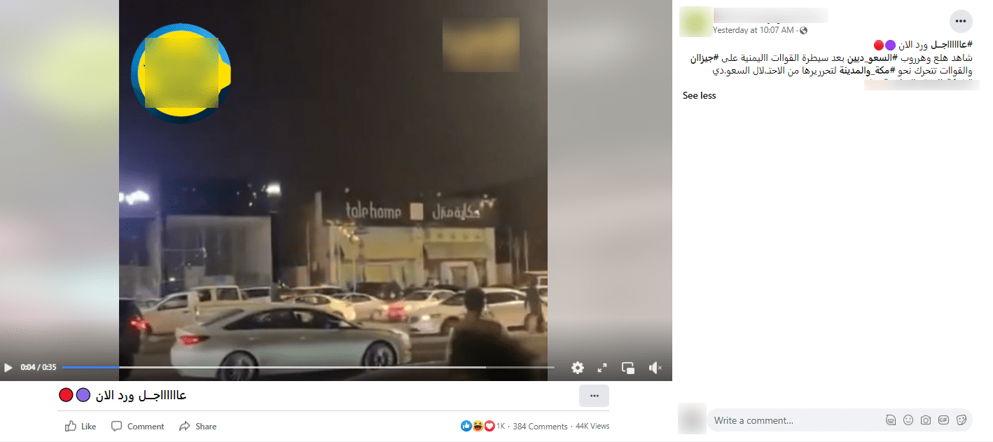 انتشر على مواقع التواصل الاجتماعي مقطع فيديو يزعم ناشروه أنه يظهر هرب وهلع المواطنين في مدينة جيزان بعد سيطرة القوات اليمنية عليها،