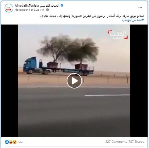 انتشر مقطع على مواقع التواصل الاجتماعي يوثق عملية نقل أشجار على شاحنات ادعى ناشروه بأنه يعود لسرقة أشجار من عفرين السورية والحقيقة أنه في الإمارات