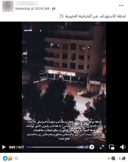 في أعقاب ذلك، تناقل ناشطون مقطعاً يدعون أنه يظهر لحظة استهداف المبنى في بيروت،