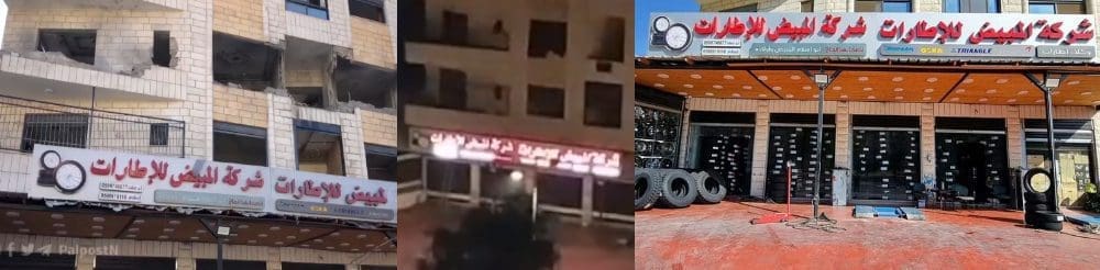 مقارنة لقطة من مقطع الادعاء (منتصف)، مع صورة للافتة أحد المحلات التجارية في مدينة نابلس (يمين)، ولقطة لآثار استهداف المنزل (يسار)
