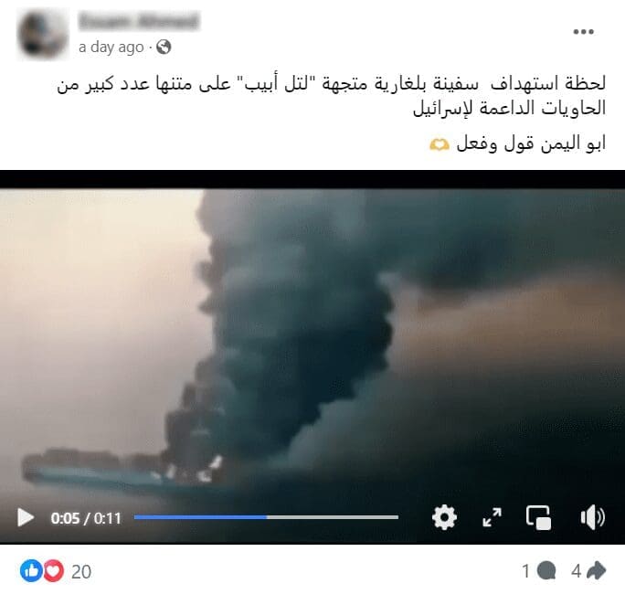 إثر ذلك تداول ناشطون على الفيسبوك مقطع فيديو يدعون أنه يظهر لحظة استهداف سفينة بلغارية كانت متجهة نحو تل أبيب،
