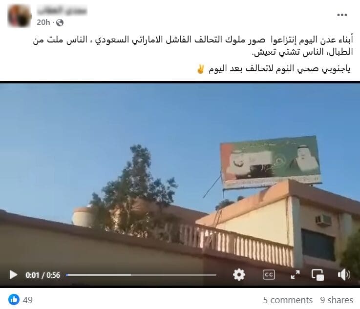 أبناء عدن اليوم إنتزاعوا صور ملوك التحالف الفاشل الاماراتي السعودي ، الناس ملت من الطبال، الناس تشتي تعيش.
