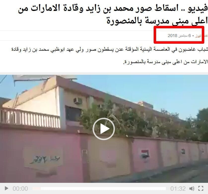 أرشد البحث العكسي عن لقطة ثابتة من مقطع الادعاء في محرك البحث جوجل إلى أنه قديم، إذ نشره أحد المواقع المحلية اليمنية بتاريخ 06 سبتمبر 2018، وأرفق في وصفه –دون تصرف-: «اسقاط صور محمد بن زايد وقادة الامارات من اعلى مبنى مدرسة بالمنصورة»