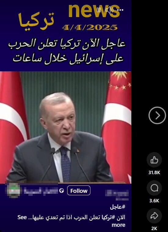 هذا المقطع مفبرك باستخدام إحدى أدوات التزييف العميق، ولا صحة لإعلان تركيا الحرب على إسرائيل