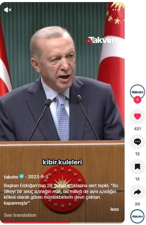 أرشد البحث العكسي عن لقطة ثابتة من مقطع الادعاء في محرك البحث جوجل إلى منصة التيكتوك، إذ نشر حساب إخباري محلي تركي “Takvim” مشاهد مطابقة للمشهد الأول من المقطع بتاريخ 05 سبتمبر 2023، وأرفق في الوصف-دون تصرف-: «رد شديد من الرئيس أردوغان على بقايا انقلاب 28 شباط: لقد ولّى زمن المستكبرين الذين كانوا يرون هذا البلد ملكًا لقلّة من الأقلية، وهذا الشعب عبدًا لتلك الأقلية منذ زمن بعيد»