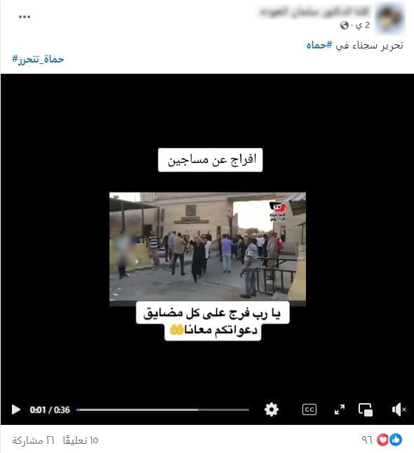 هذا المقطع يصور إطلاق سراح معتقلين من سجن طرة في مصر عام 2017، وليس من إطلاق سراح السجناء في حماة مؤخرًا