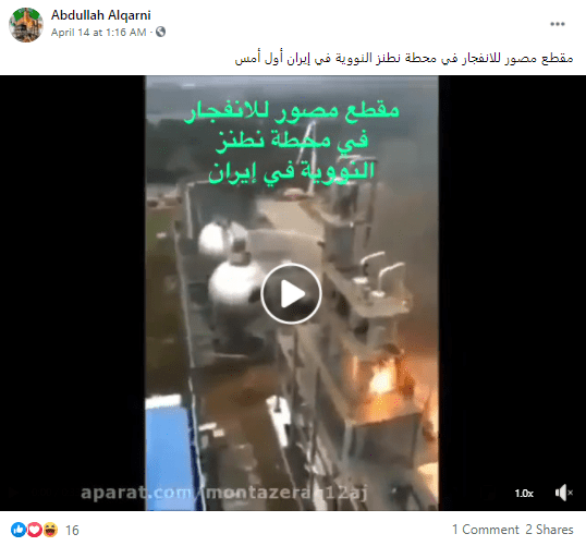 انتشر على مواقع التواصل الاجتماعي فيسبوك وتويتر مقطع فيديو يزعم ناشروه أنه يظهر انفجار محطة نطنز النووية في إيران،