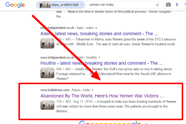 وكان موقع indiatimes في النتائج الاولى من البحث، فيما تعرف محرك بحث غوغل على الصورة فورًا تحت عنوان Yemen war.