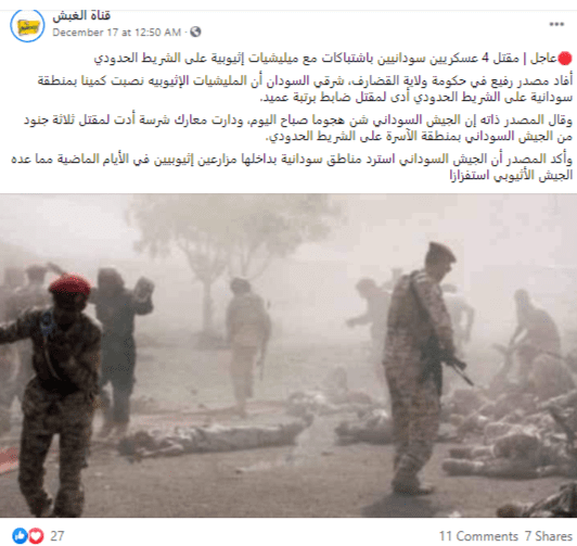انتشر على مواقع التواصل الاجتماعي صورة تظهر جنود عسكريين وضحايا وادعى ناشرو الصورة بأنها تعود لضحايا من السودان