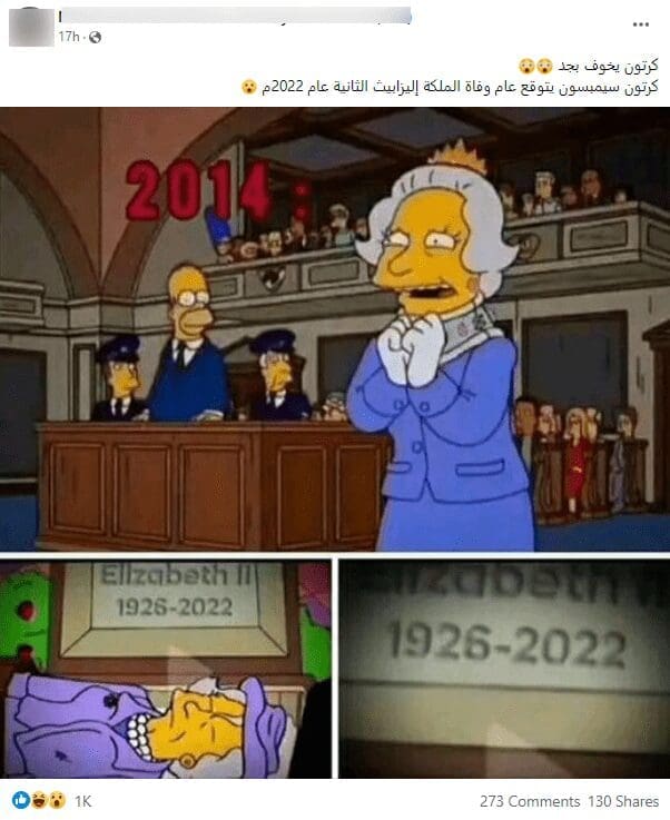إثر ذلك تداول ناشطون على مواقع التواصل الاجتماعي صورة يزعمون أن مسلسل سيمبسون الشهير تنبأ عام 2014 بوفاة الملكة إليزابيث الثانية عام 2022،