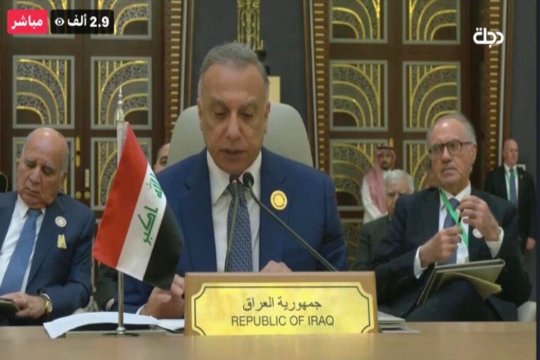 لقطات شاشة مركبة من البث المباشر لكلمة رئيس الوزراء العراقي خلال مؤتمر قمة جدة 2022