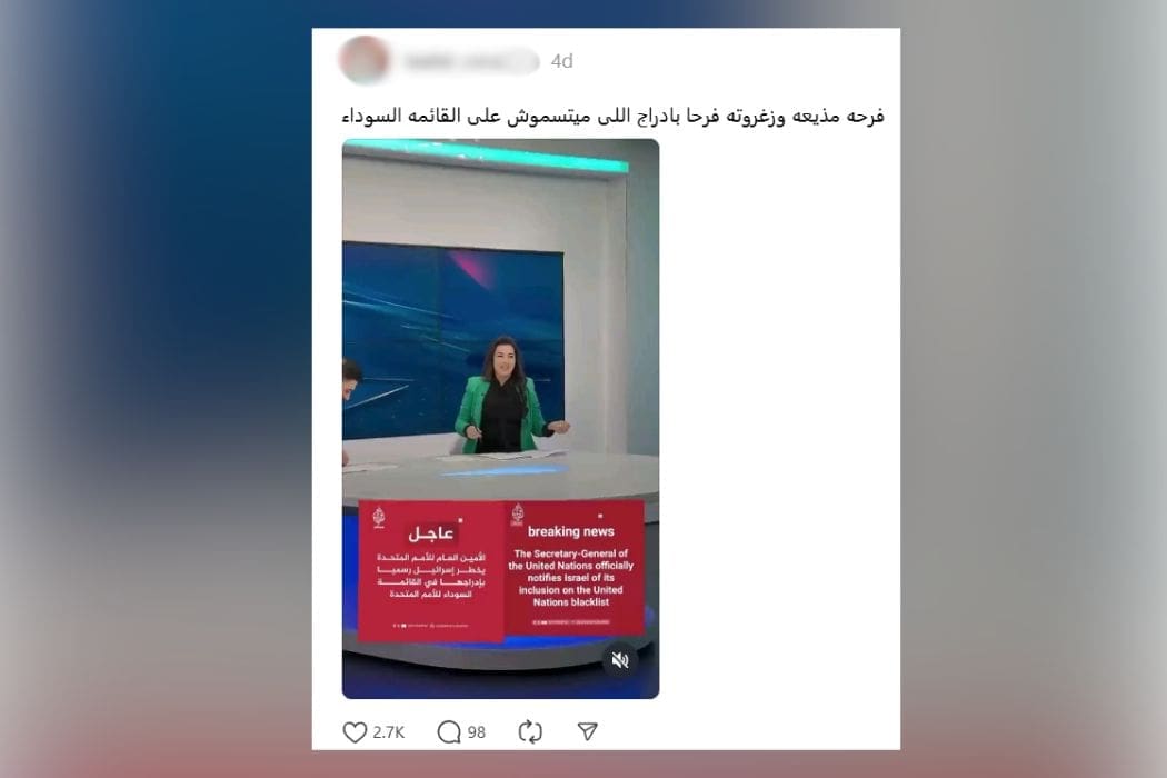 هذا المقطع يظهر احتفال الإعلامية أسماء زرمان بفوز منتخب الجزائر بكأس العرب 2021، وليس بسبب إدراج الجيش الإسرائيلي في قائمة الأمم المتحدة العالمية لمرتكبي الانتهاكات ضد الأطفال