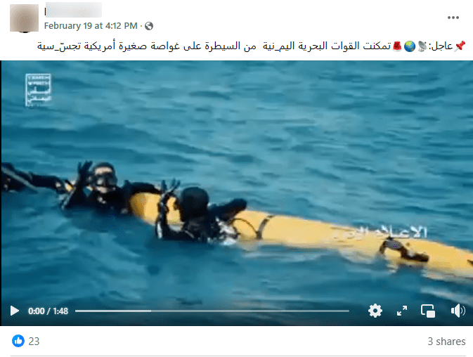 نقلًا عن وكالة فرانس -دون تصرف-: “قال المتحدث باسم حركة الحوثي اليمنية محمد عبد السلام في بيان الأحد 04 فبراير الماضي “إن استمرار العدوان الأمريكي البريطاني على اليمن لن يحقق للمعتدين أي هدف ولن يؤثر على قرار اليمن إظهار دعمه لقطاع غزة الفلسطيني”. في هذا السياق، تداول ناشطون على فيسبوك مقطعاً يدعون أنه يظهر سيطرة القوات البحرية اليمنية التابعة للحوثيين على غواصة أمريكية مؤخرا،