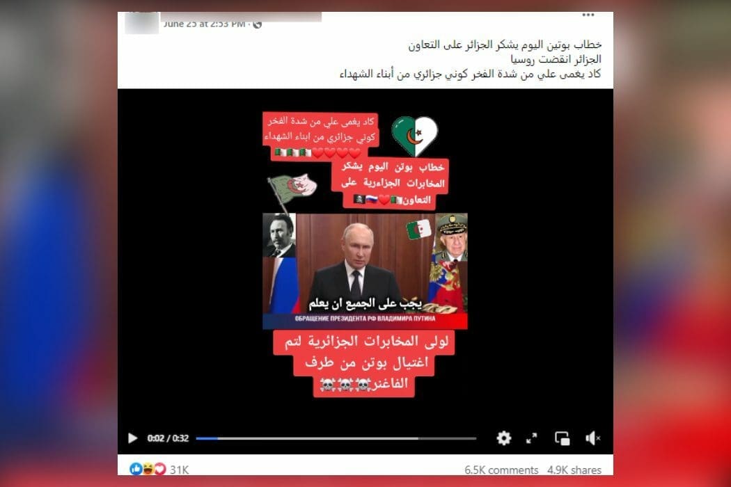 ترجمة هذا المقطع لخطاب بوتين غير صحيحة، ولم يتحدث فيه عن المخابرات الجزائرية