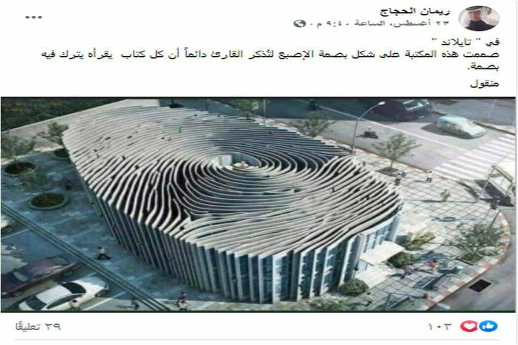 هذه الصورة عبارة عن تصميم رقمي، وليست مكتبة حقيقية على شكل بصمة إصبع في تايلاند