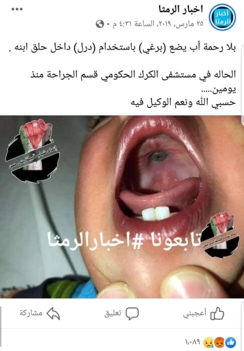 فكان من بين الصفحات التي نشرته: صفحة اخبار الرمثا التي نسرته بتاريخ 25 مارس 2019 الساعة 4:31 مساءً، وحاز المنشور على 1,089 تفاعل، وتمت مشاركته 45 مرة، حتى آخر تحديث. وصفحة العيزريه الحدث التي نشرته بنفس التاريخ، الساعة 5:47 مساءً. بالإضافة إلى العديد من الصفحات والحسابات الشخصية وكعيّنة منها، يمكنك الاطلاع هنا و هنا و هنا