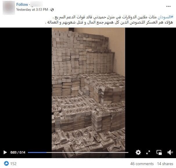 في أعقاب ذلك، تناقل ناشطون على فيسبوك مقطعاً يدعون أنه يصوّر ملايين الدولارات عُثر عليها في منزل محمد حمدان دقلو،