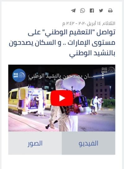 نحصل على العديد من النتائج، بينها مقالات مختلفة لمواقع إخبارية نشرت عن تفاعل المواطنين الإماراتيين مع حملات التعقيم بترديد النشيد الوطني الإماراتي (هنا، هنا وهنا)،