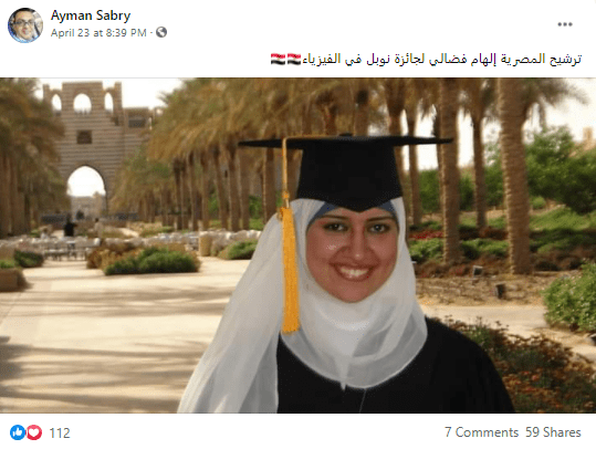 تداول رواد مواقع التواصل الاجتماعي ادّعاء يزعم ترشيح الباحثة المصرية الهام فضالي لجائزة نوبل في الفيزياء،