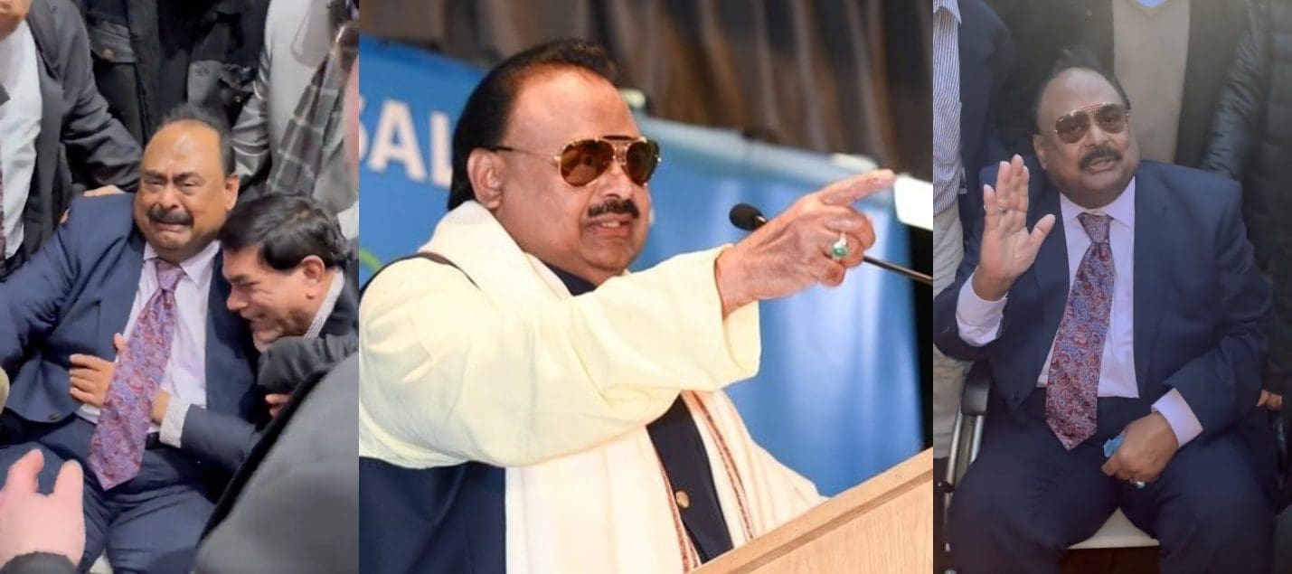 ألطاف حسين، إلى اليمين لقطة من مقطع مشابه، مقارنةً مع لقطة من مقطع الادعاء أقصى اليسار، يتوسَّطهما صورة شخصية من حسابه الشخصي عبر منصة إكس
