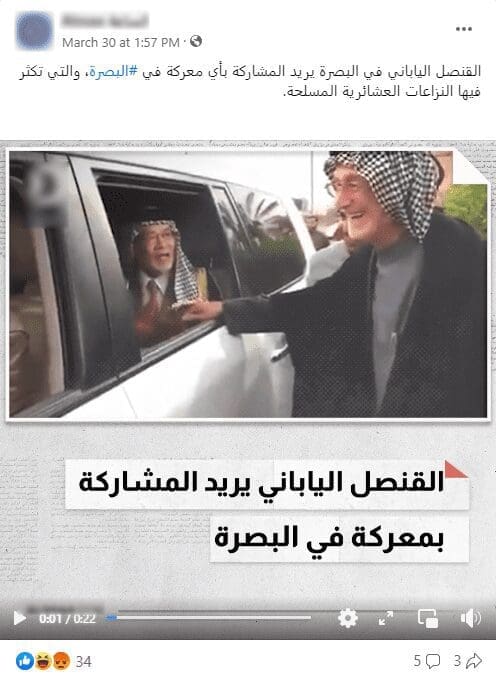 تناقل ناشطون على فيسبوك مقطعًا يدّعي ناشروه أنه يظهر القنصل الياباني في البصرة يبدي استعداده للمشاركة في معارك عشائرية.