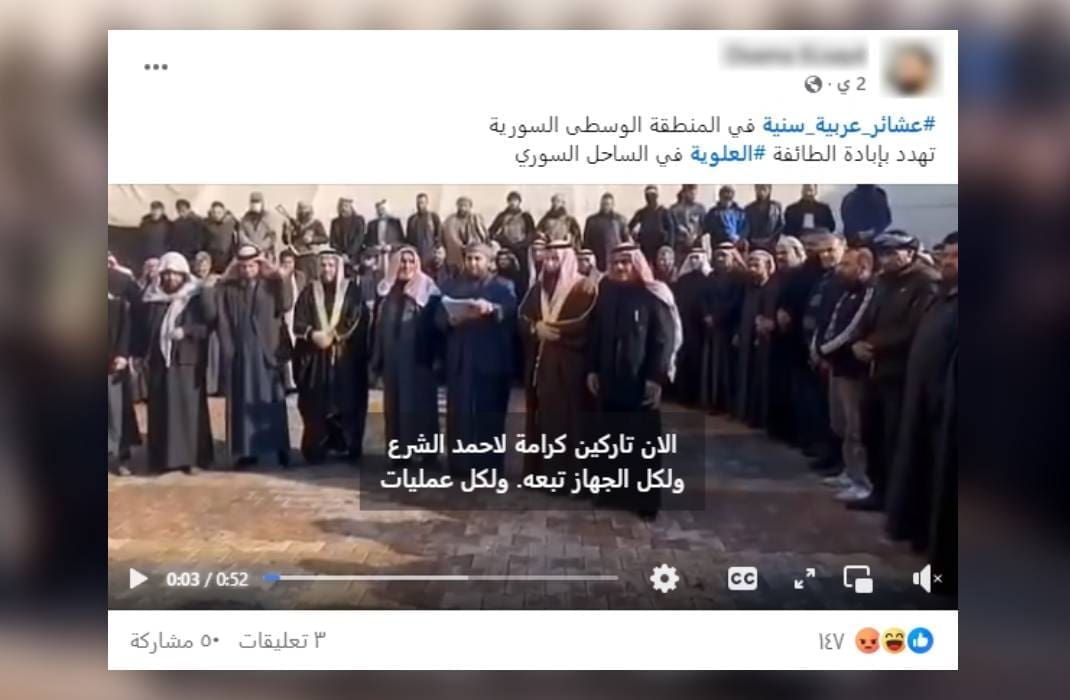 الصوت المسموع بهذا المقطع مفبرك، والمقطع الأصلي قديم منذ عام 2022 ولا يصور تهديد العشائر السنية للطائفة العلوية في سوريا مؤخرًا