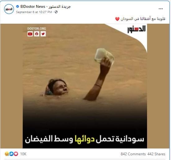 انتشرت على مواقع التواصل الاجتماعي صورة امرأة تحاول النجاة من الغرق وسط فيضان ، وادعى ناشروها بأنها سودانية تحمل دواءها بعدما جرفتها السيول خلال فيضانات السودان الأخيرة.