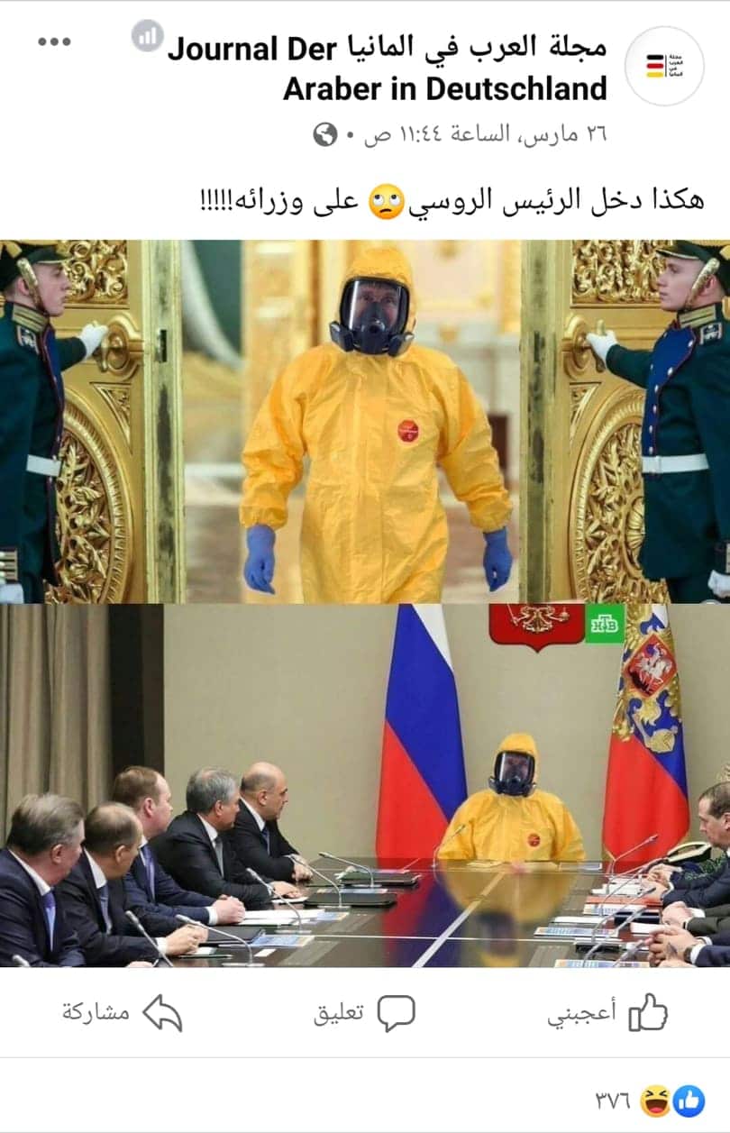 انتشرت صور على مواقع التواصل الاجتماعي للرئيس الروسي فلاديمر بوتن وهو يجتمع مع وزرائه، ويظهر بوتن وهو يرتدي لباسًا للوقاية الصحية خوفًا من فيروس كورونا.