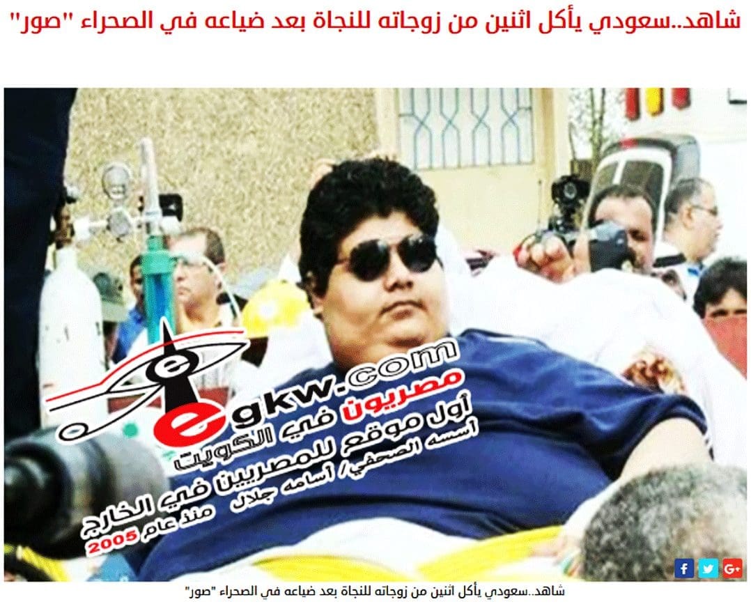 والصورة المتداولة على الصحيفة هي للسعودي خالد محسن الشاعري 24 عاما، والمعروف بأضخم رجل، والمصاب بمرض منذ الطفولة جعل وزنه يصل إلى 600 كيلوجرام وقد قام خالد بإجراء عملية للتخلص من ذلك الوزن