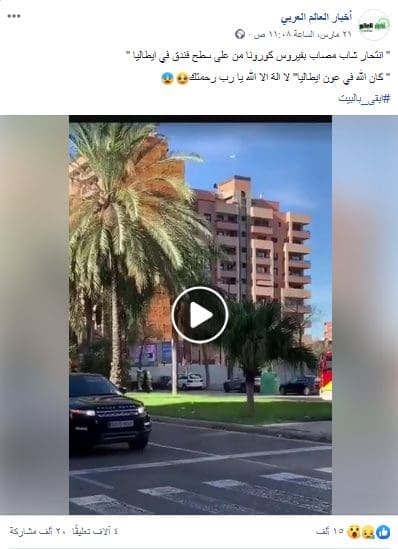 لقطة تظهر انتشار الفيديو في نهاية 2019 وحادثة الانتحار في أسبانيا وليس ايطاليا ولا علاقة لها بفيروس كوروناتم
