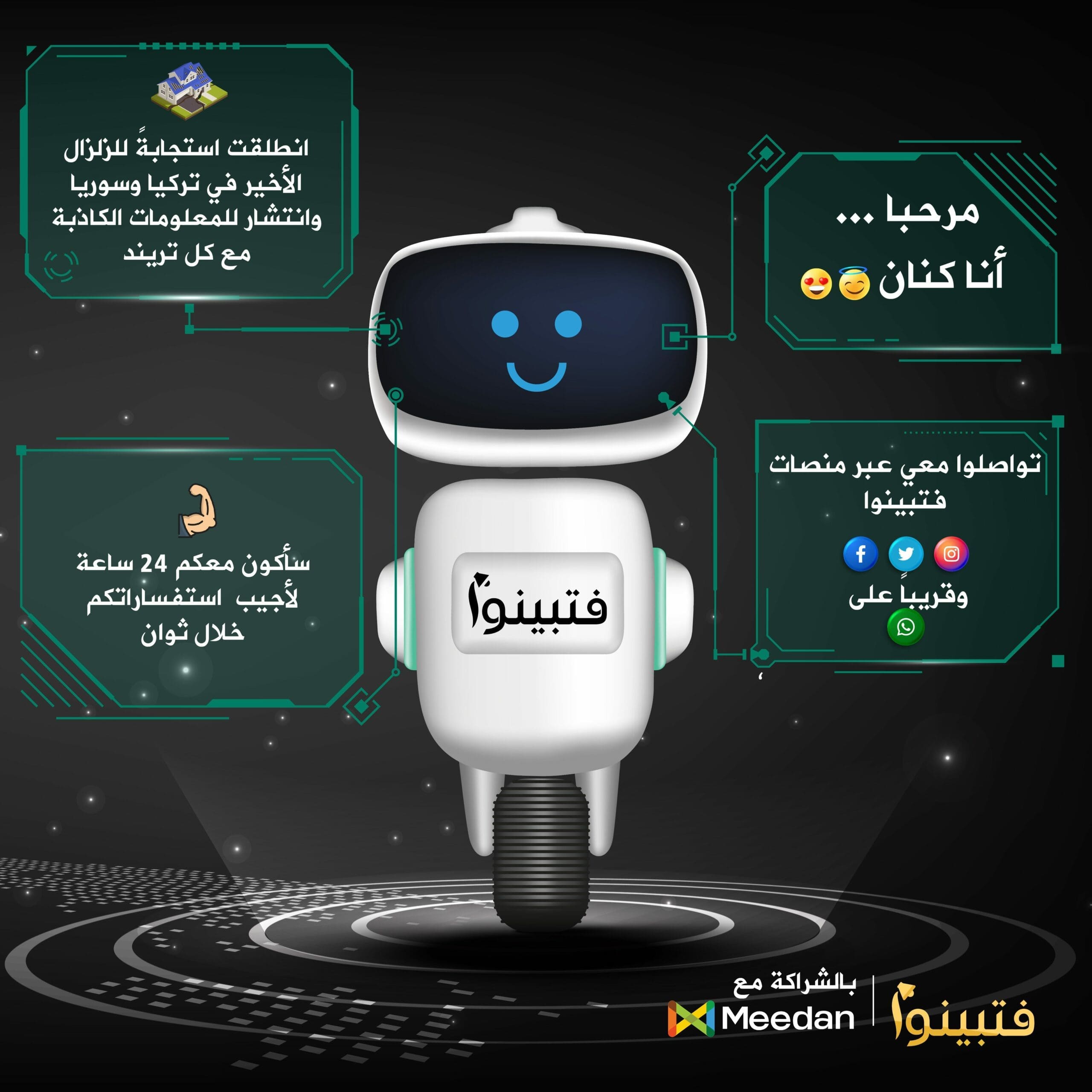 استجابةً للزلزال الأخير الذي ضرب تركيا وسوريا والانتشار المتزايد للمعلومات الكاذبة على وسائل التواصل الاجتماعي مع كل حَدَث تعلن منصة فتبينوا بالشراكة مع “Meedan” وهي منظمة تكنولوجية غير ربحية تهدف إلى تعزيز دور الصحافة عبر تطوير البرامج والمبادرات ، عن إطلاق المساعد الذكي “كِنَان” للتحقق من المعلومات ، حيث يمكن التواصل مع المساعد الذكي “ كِنَان ” ، عبر حسابات فتبينوا على انستغرام ، فيسبوك ماسنجر ، تويتر ، وقريباً على واتساب.
