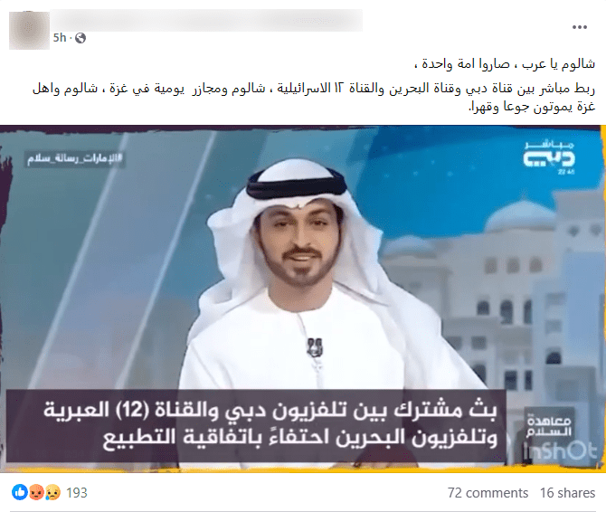 ومنذ أن قامت الإمارات العربية المتحدة بتطبيع العلاقات مع إسرائيل عام 2020 تتلقى انتقادات واسعة على مواقع التواصل، في هذا السياق تناقل مستخدمون على منصات التواصل مقطعاً يدعون أنه لبث مشترك بين تلفزيون دبي وتلفزيون البحرين وقناة 12 العبرية احتفالاً باتفاقية التطبيع بينهم،