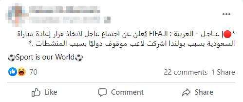 تناقل ناشطون على فيسبوك خبرًا يدّعي ناشروه أن الفيفا أعلنت نيتها عقد اجتماع عاجل لاتخاذ قرار بإعادة مباراة السعودية وبولندا،