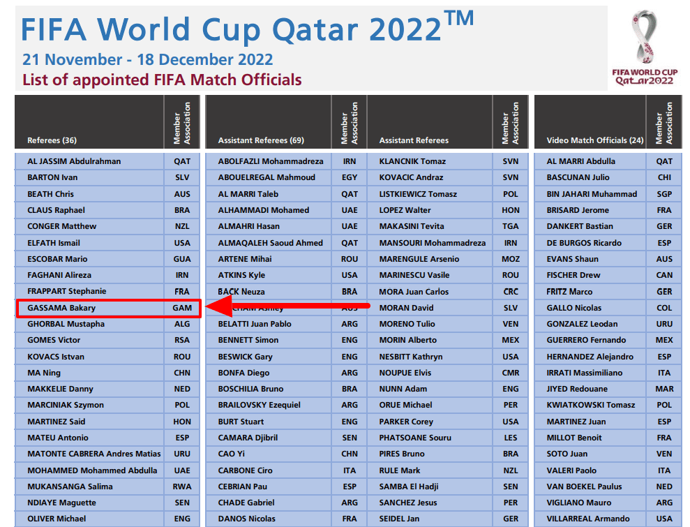 عثرنا على اسم الحكم الغامبي بكاري غاساما ضمن القائمة النهاية مما ينفي صحة استبعاده،