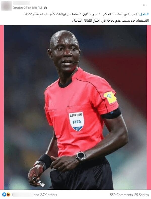 انتشر على مواقع التواصل الاجتماعي خبرٌ يزعم ناشروه أن الاتحاد الدولي لكرة القدم (فيفا) تستبعد الحكم الغامبي بكاري غاساما من لائحة حكام كأس العالم 2022 قطر، فما حقيقة هذا الخبر؟