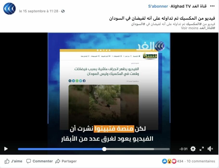 حيث نَسبَ مشاهد مصورة تظهر انجراف قطيع ماشية بسبب فيضانات وقعت في المكسيك متم شهر يوليو 2020 على أساس أنها حدثت في السودان نهاية أغسطس المنصرم.