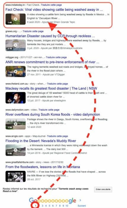 بالاستعانة بالكلمات المفتاحية (سيول تجرف أبقار فيضان نهر) باللغة الإنجليزية ( Torrents wash away cows flood a river) في محرك البحث جوجل قسم الفيديوهات، نقع على عدة نتائج،