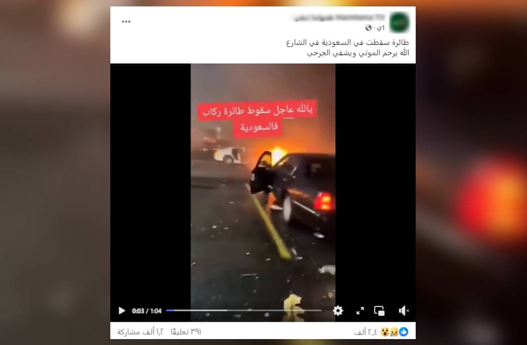 تناقل ناشطون على منصة فيسبوك مقطعًا من عدة مشاهد يدعون أنها تصور سقوط طائرة ركاب في السعودية مؤخرًا، إلا أن التحري الذي أجراه فريق منصة «فتبينوا» كشف أن هذا الادعاء زائف والمشاهد قديمة،