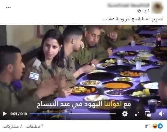 إذ نشرت المشاهد ذاتها بمدة أطول بتاريخ 21 أبريل 2022، على أنه يعود إلى مائدة إفطار رمضاني تجمع جنود الجيش الإسرائيلي في وحدة الاستطلاع الصحراوية،