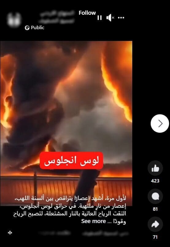 بحسب فرانس 24: «اندلع حريق هائل الثلاثاء قرب مدينة لوس أنجلس الأمريكية، ما أجبر نحو 30 ألف شخص على إخلاء منازلهم الواقعة في التلال المهددة بالنيران. السلطات حذرت من انتشار النيران بسرعة بسبب الرياح العاتية، مشيرة إلى أن الحريق يواصل تمدده بقوة.» إثر ذلك تداول ناشطون على الفيسبوك مقطع فيديو يدعون أنه يظهر أعاصير من نارٍ ملتهبة في حرائق لوس أنجلوس.