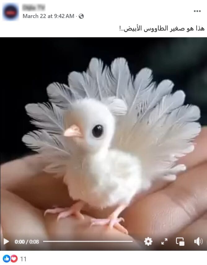 مشاهد هذا المقطع مولدة باستخدام إحدى برامج الذكاء الاصطناعي، ولا تظهر صغير طاووس حقيقي