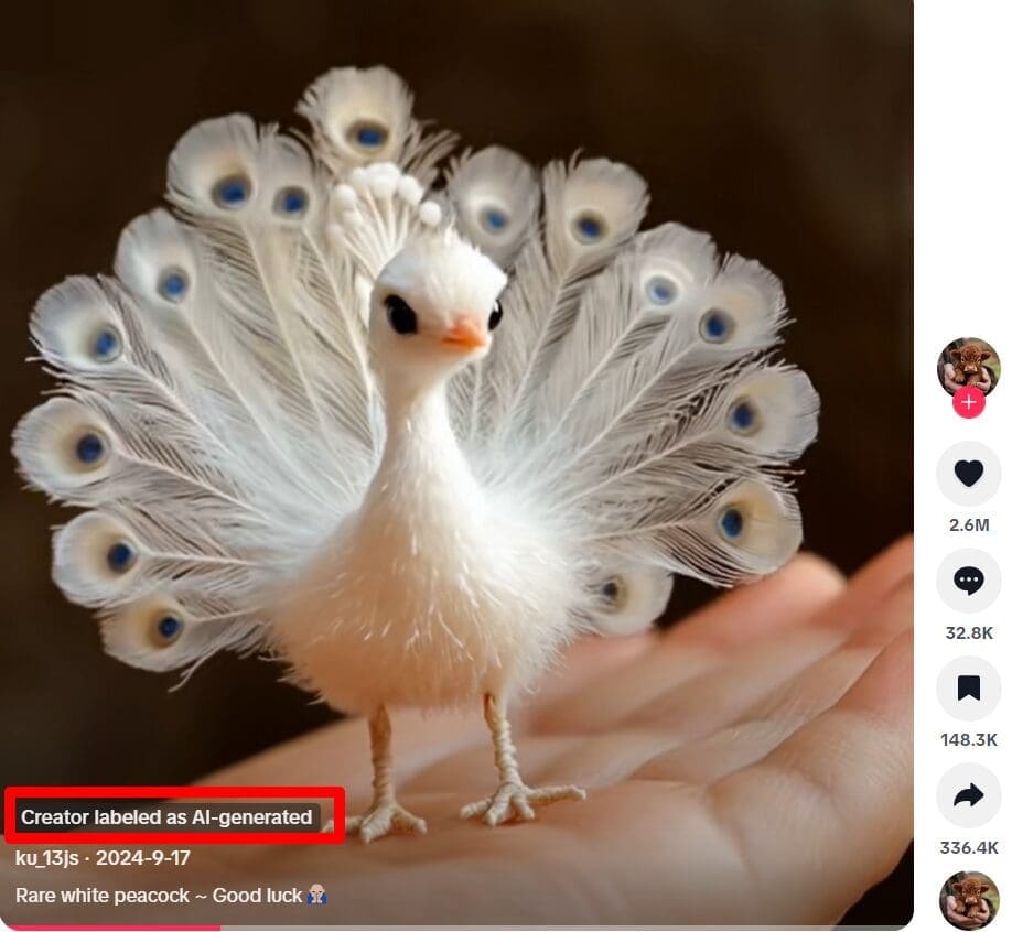 باستمرار البحث بالكلمات الدلالية “Very cute baby peacock” وقع الفريق على المقطع الأصلي منشورًا بتاريخ 17 سبتمبر 2024 في منصة التيكتوك عبر حساب مختص بتوليد المقاطع بالذكاء الصناعي.