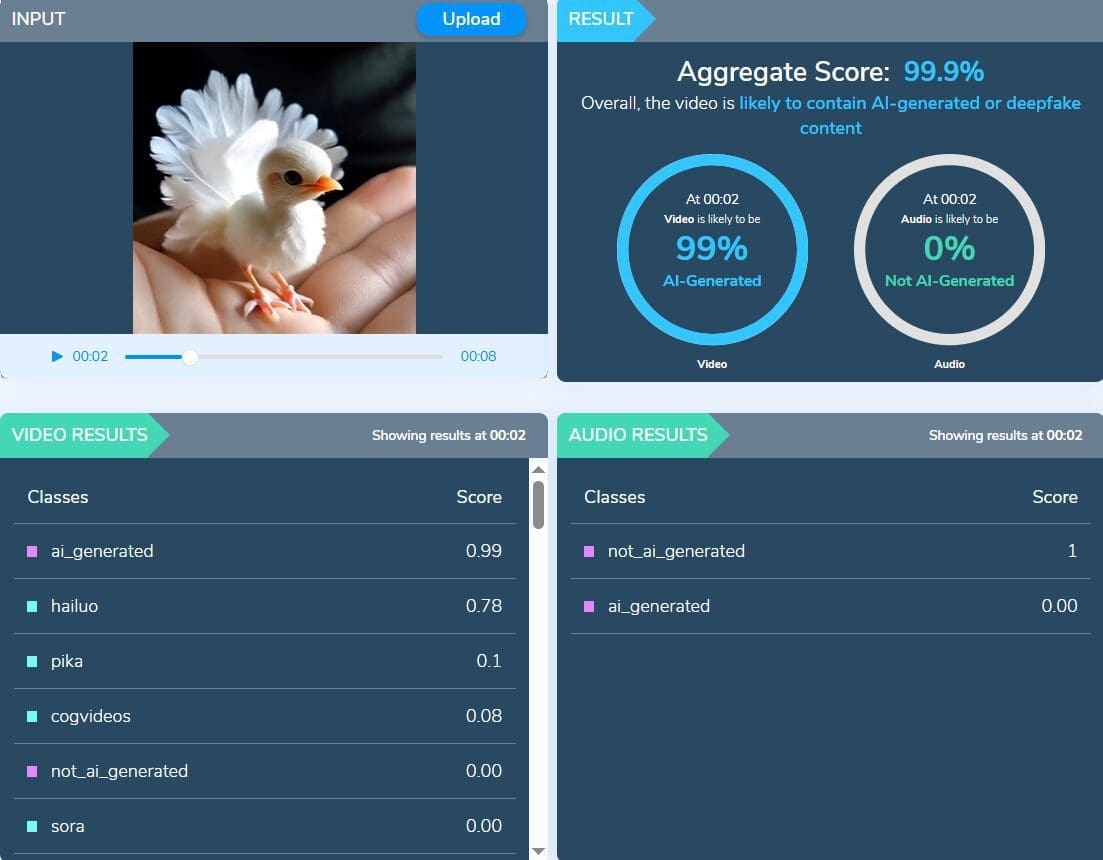 إلى ذلك؛ كشفت أداة Hive AI detector المتخصصة بفحص الصور والمقاطع المولدة بواسطة الذكاء الاصطناعي أن مشاهد المقطع قد تكون مولدة بواسطة الذكاء الاصطناعي بنسبة 99.9%.